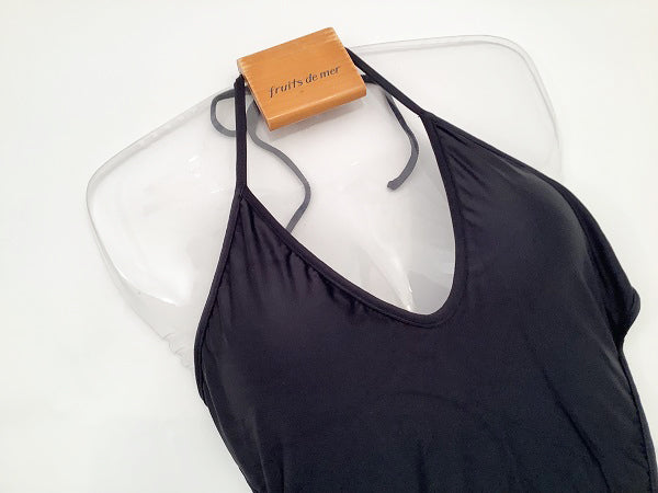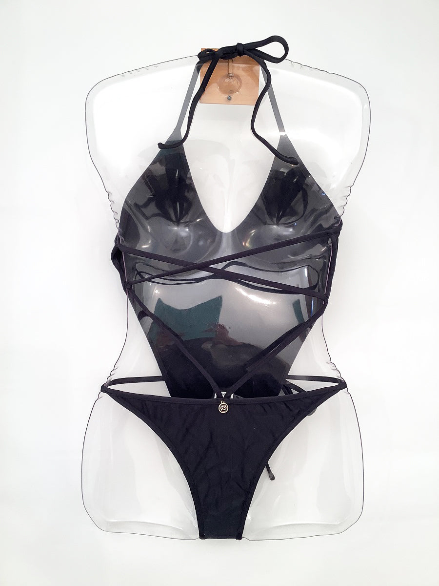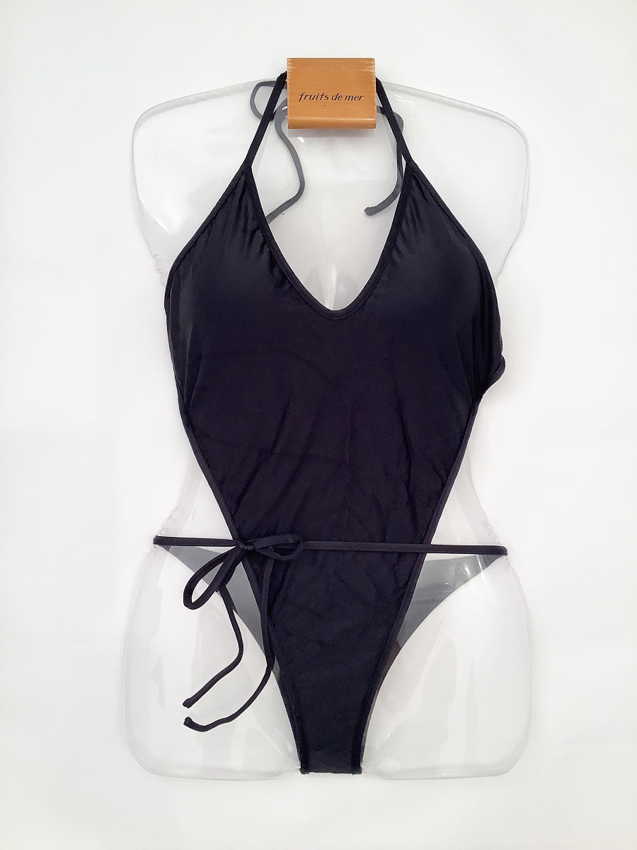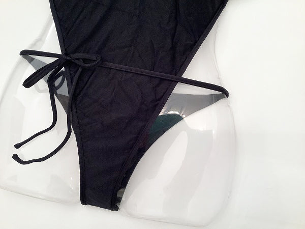 バックスタイルの紐使いが特徴のワンピースビキニ。シンプルですがデザインでアクセントを。