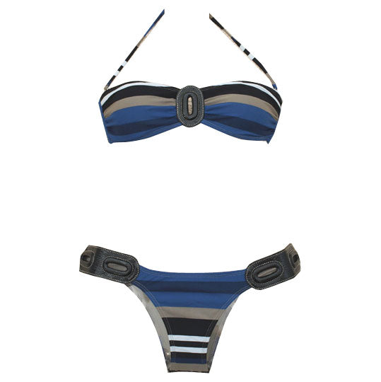 モードなテンションのボーダーとレザーパーツがクールなバンドゥビキニ。