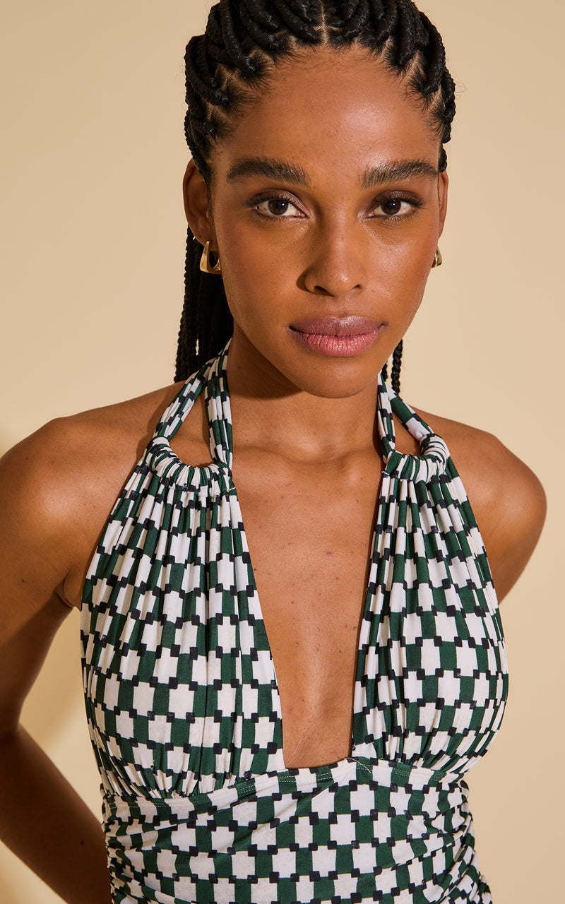 ネック部分の紐と贅沢なギャザーのアレンジで、ホルターのように大胆な着こなしもできますし、クロップのように胸元をカバーして着用する事もできます。