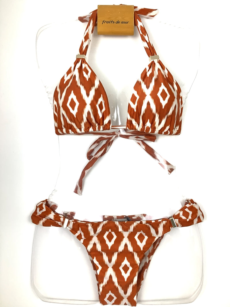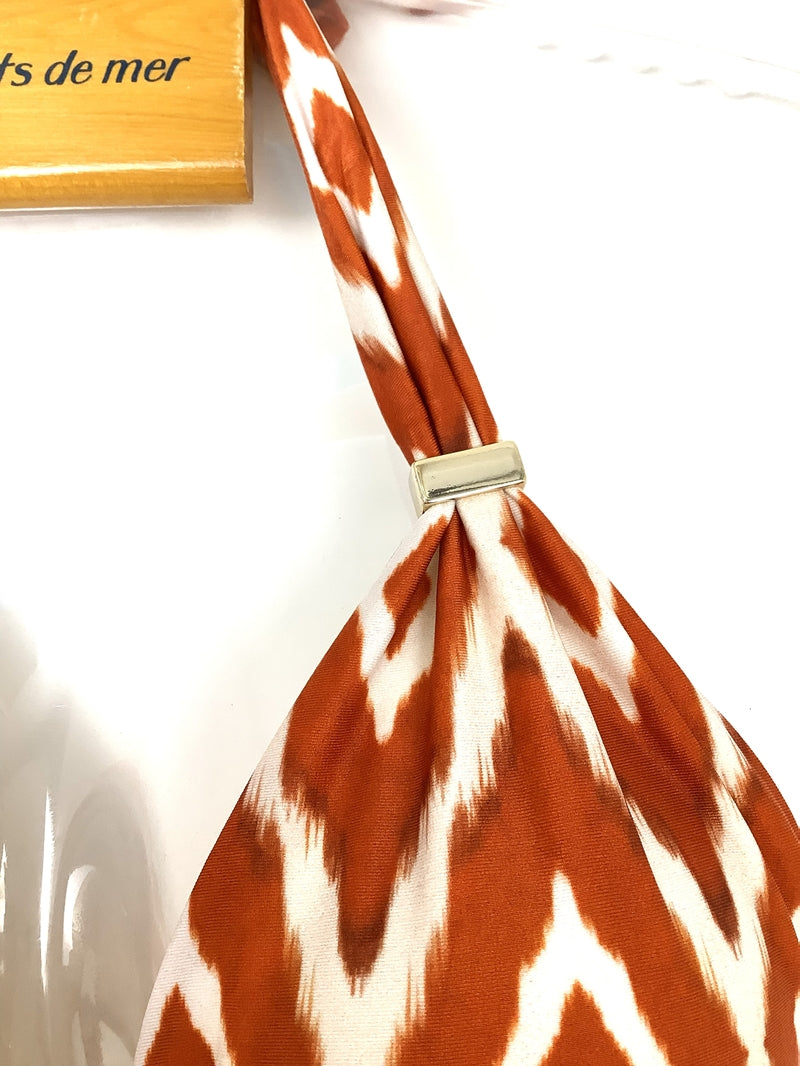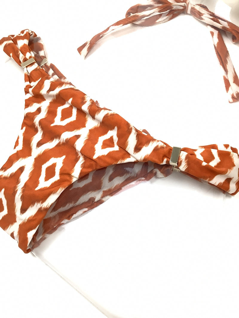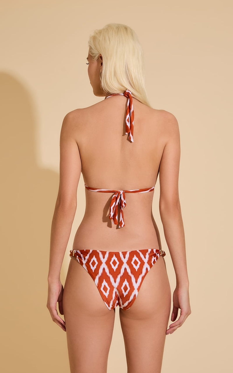 ブラのパーツをスライドさせて布の面積を調節できます。パーツを下げてブラの三角部分を小さくし日焼け跡までスマートでセクシーに。パーツを上げて布面積を大きくし贅沢なドレープを楽しむ大人なホルタービキニに。ボトムスのパーツを内側にスライドさせてコンパクトなカッティングを楽しむことも、外側にスライドさせて安心な布面積で着用することもできます。注意点としましては、生地にダメージをあたえないように、ゆっくり慎重にパーツをスライドさせてください。