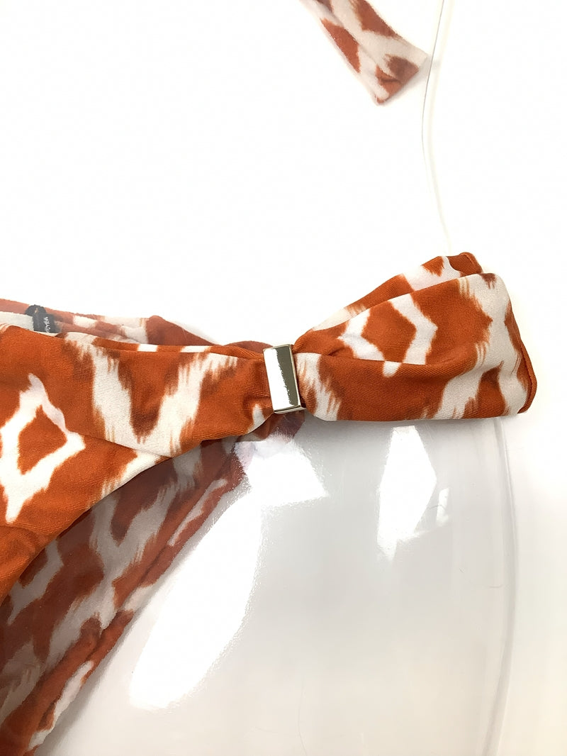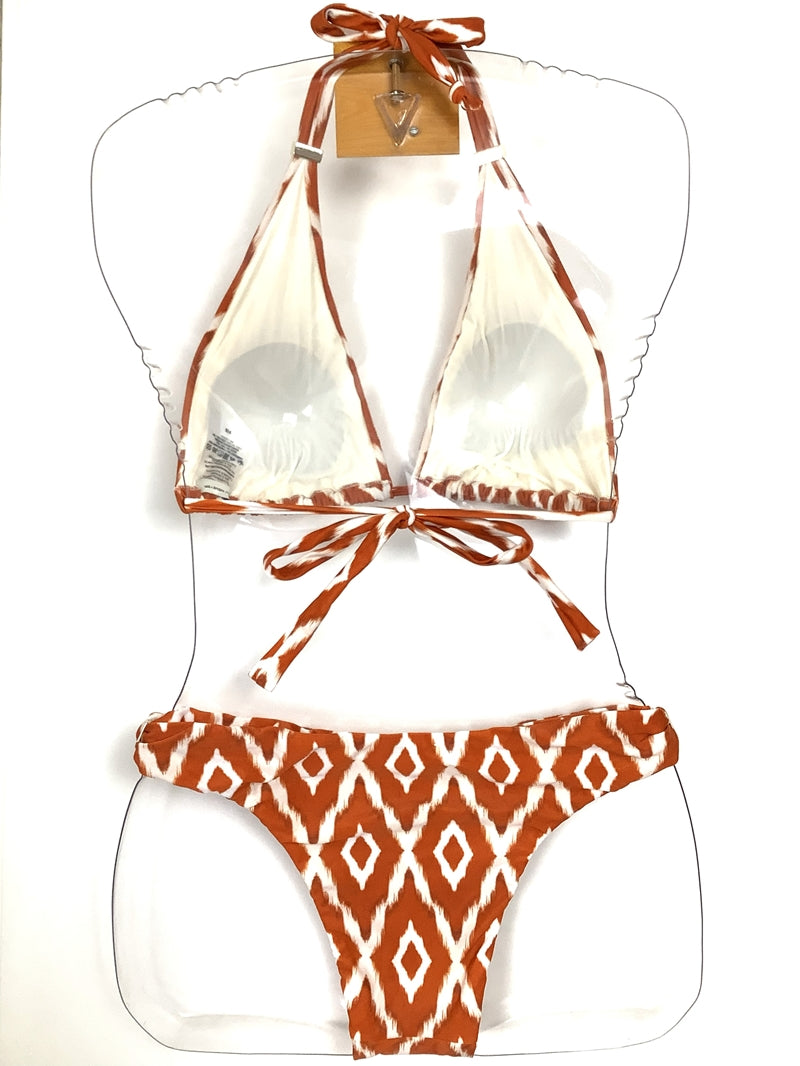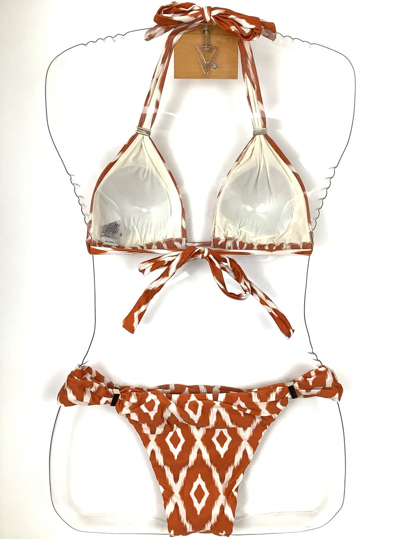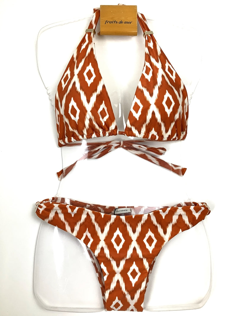 ブラのパーツをスライドさせて布の面積を調節できます。パーツを下げてブラの三角部分を小さくし日焼け跡までスマートでセクシーに。パーツを上げて布面積を大きくし贅沢なドレープを楽しむ大人なホルタービキニに。ボトムスのパーツを内側にスライドさせてコンパクトなカッティングを楽しむことも、外側にスライドさせて安心な布面積で着用することもできます。注意点としましては、生地にダメージをあたえないように、ゆっくり慎重にパーツをスライドさせてください。