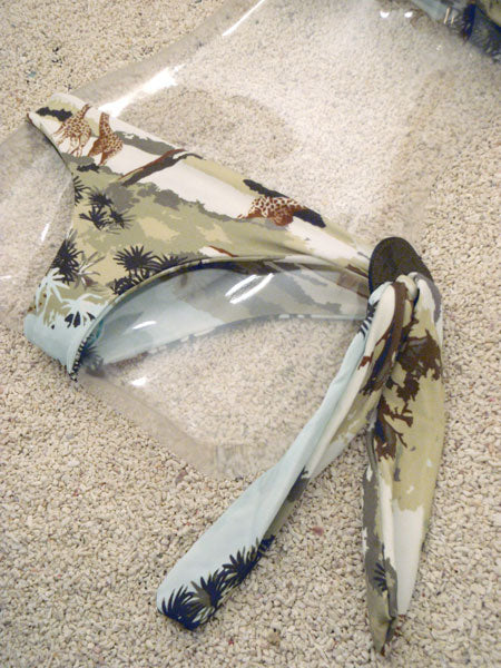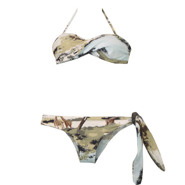 サバンナをイメージしたプリントに、ボトムサイドのパーツ使いが高級感のある一着。